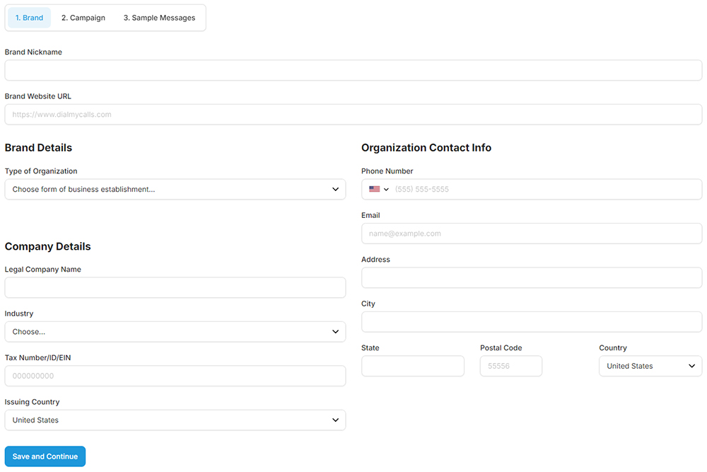 The contact information for your organization is required and needs to be 100% accurate to ensure your 10DLC registration is approved.