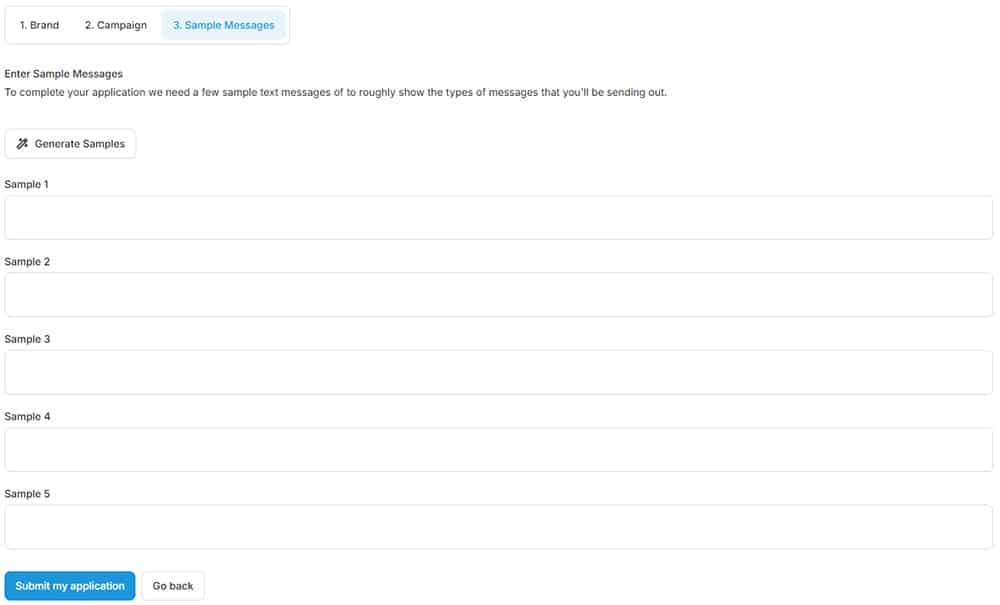 To complete your application we need a few sample text messages to show the types of messages that you’ll be sending out. We recommend at least 5 sample messages that are identical to actual messages you will be sending out.