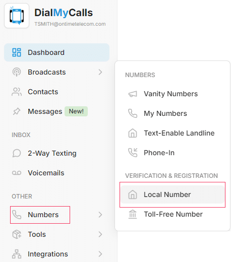 Click on “Numbers” -> “Local Number” to begin the process of submitting your 10DLC to the campaign registry for approval.