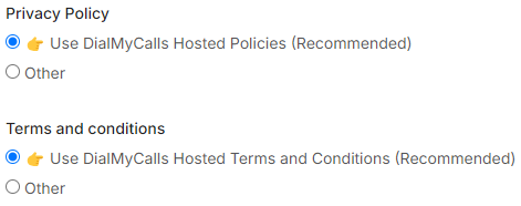 Terms of Service or Terms and Conditions are optional at this time – they are not required for 10DLC registration. DialMyCalls now offers a hosted Terms of Service option to help streamline your registration process – the hosted terms of service will be automatically submitted with your registration.