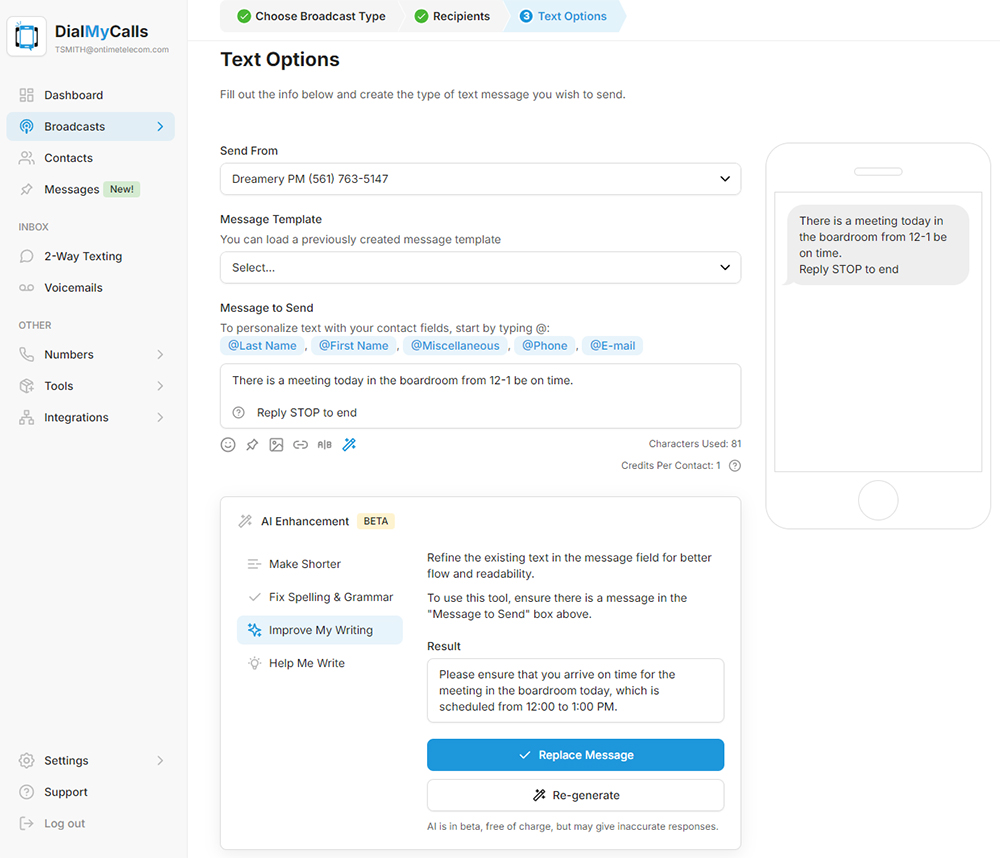 That four-figure number makes text messaging powerful for businesses, from operations to customer engagement. Companies must deliver explicit, professional, and captivating content. Embracing tools like DialMyCalls’ AI text enhancer can make a remarkable difference in the quality of your business text messages, ultimately enhancing engagement and fostering more polished communication. It’s an exciting opportunity to elevate your brand’s presence!