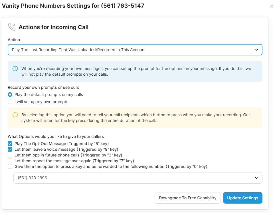 Create your own hotline by purchasing a vanity number to use with DialMyCalls. Let customers or organization members call into your phone number and give them the option to listen to a recording you set as well as leave you a voicemail that can be listened to directly in your account.