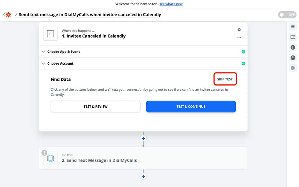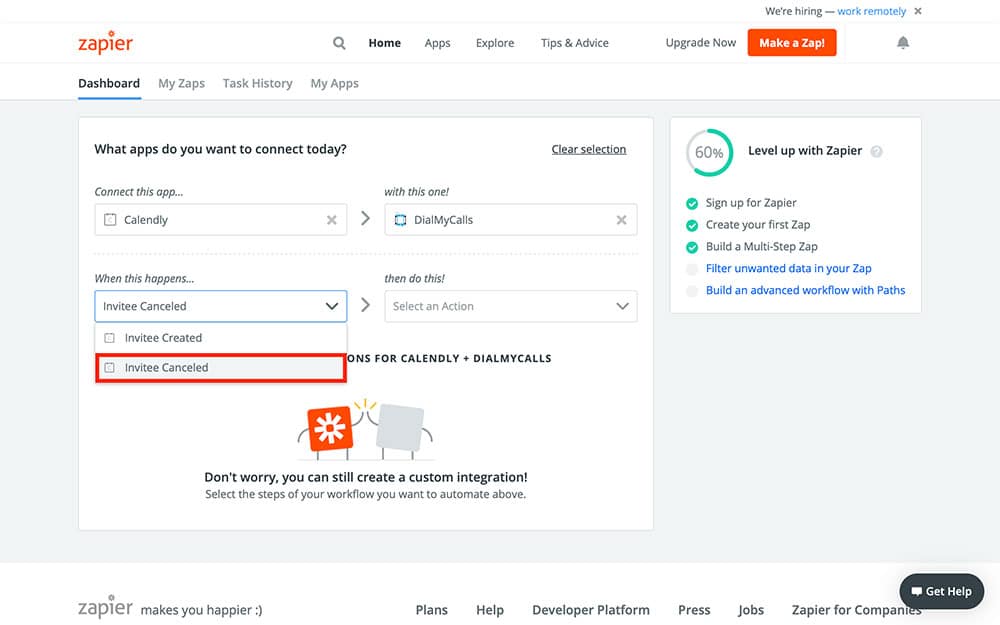 To do this, just type each app’s name into the same fields as we have above. Puting them in this order, with Calendly first, will ensure that Calendly is our Trigger app (the one that starts the Zap) and DialMyCalls is our Action app (the one that acts when the Zap runs).