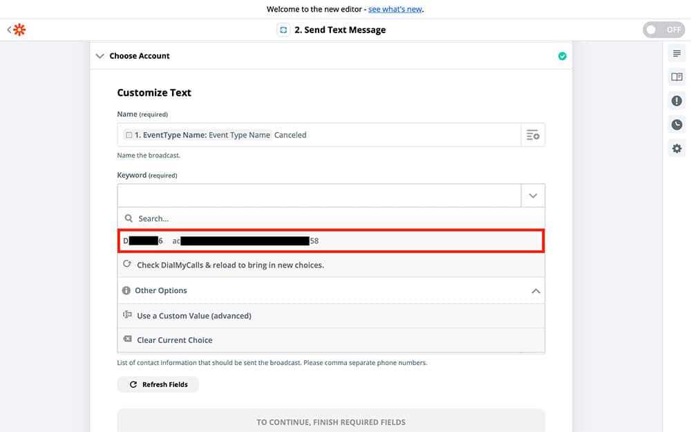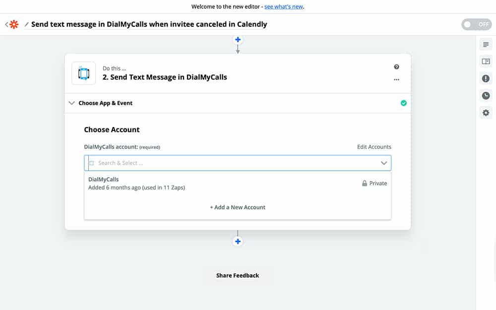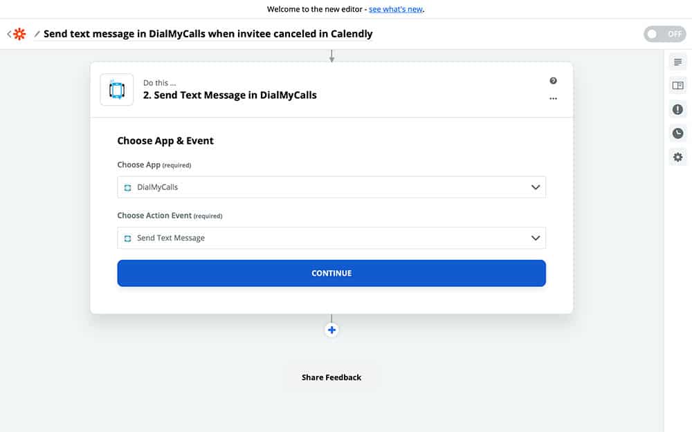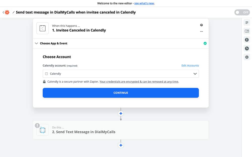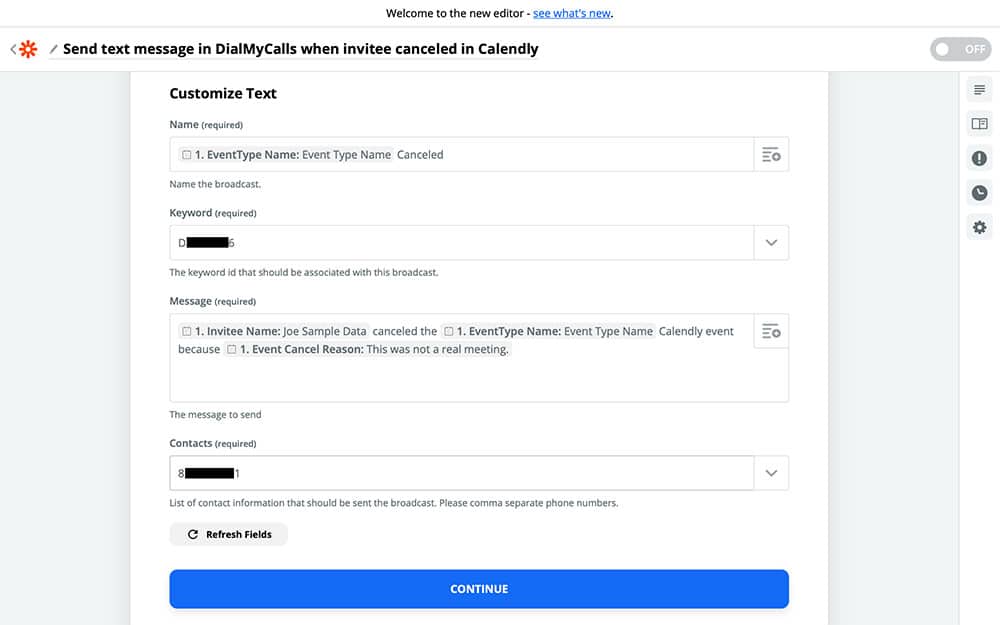If you haven’t used DialMyCalls with Zapier before, then you’ll need to set it up with Zapier, similar to the way that we connected Calendly. Once you have your DialMyCalls account connected and selected, you can Continue to the next step.
