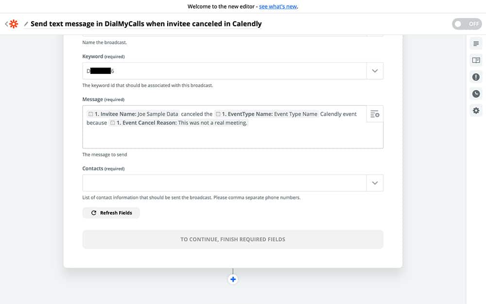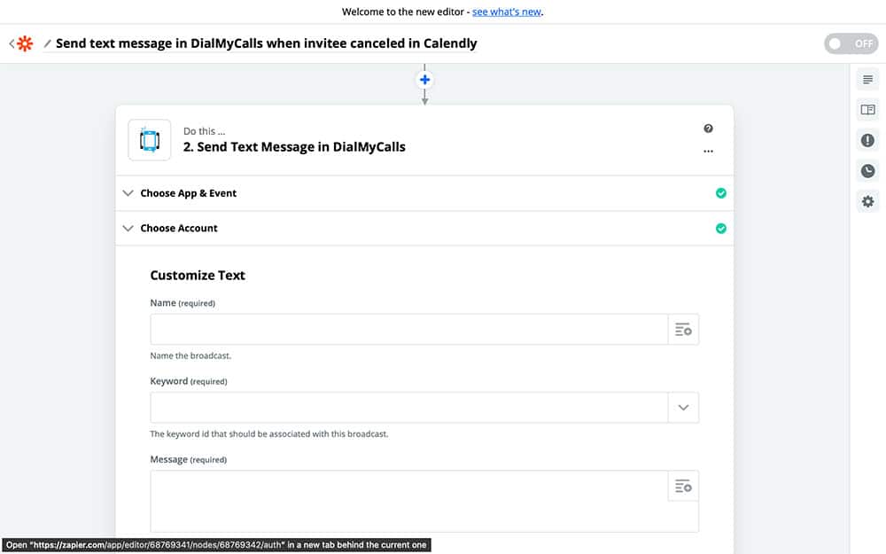 With your Calendly account connected, it’s time to start creating your DialMyCalls Action. This is what your Zap is going to do every time it runs. After completing the previous step, you should see the following screen: