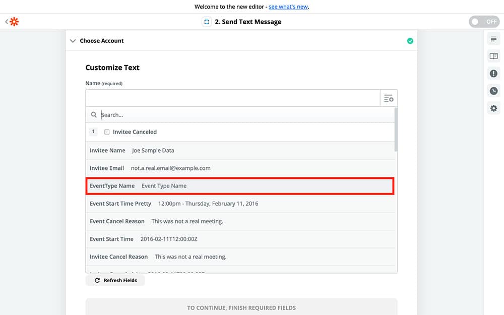 Now it’s time to create your Message. As you can probably guess, this is what the message is going to say once you receive it. You can fill it in with something as simple as, “This event has been canceled,” though that doesn’t really take full advantage of what Zapier has to offer. You can combine a written message with variables from the dropdown menu to provide you with exact information about which event has been canceled, who has canceled it, and even why they canceled it.