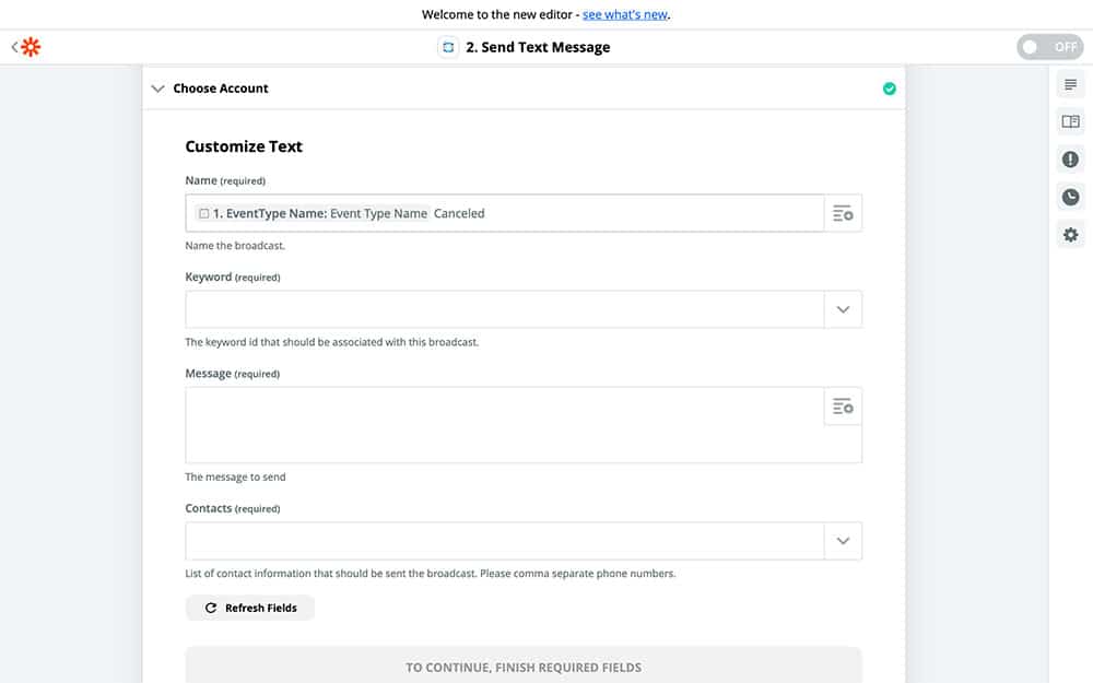 This is your Action template. As we fill it in, your Zap will begin to take shape and function as intended. In our case, we’re going to use this Zap to send a text message, so everything we will fill out in this template will set up what our text message looks like and who it’s going to be sent to.