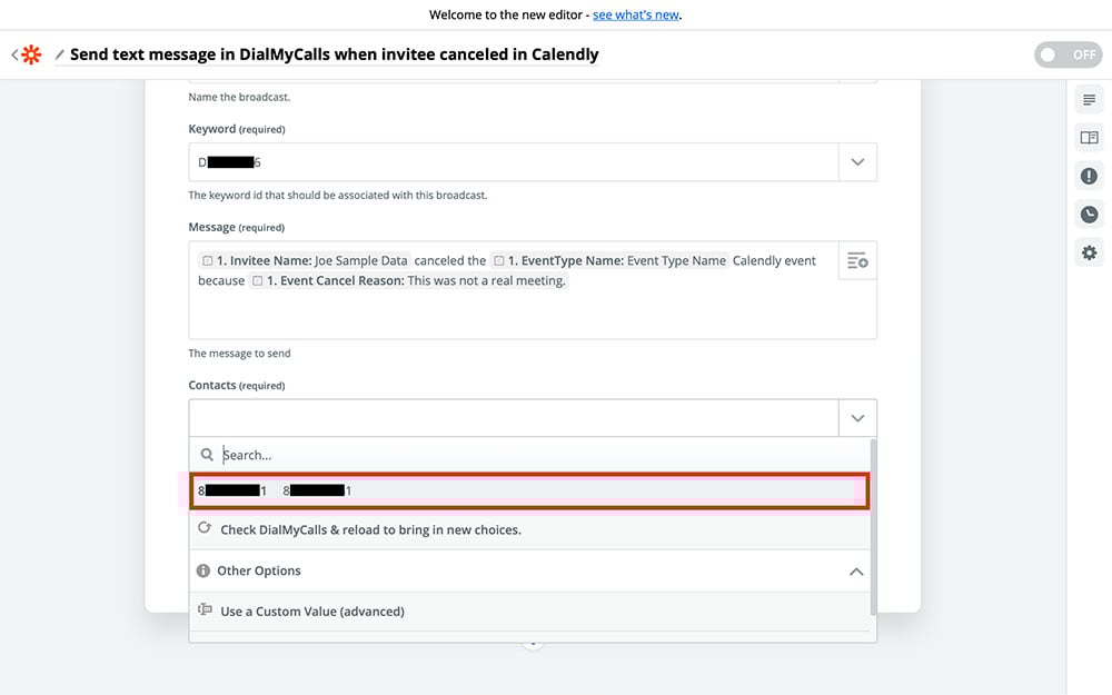 Once you’re happy with your message, all that’s left to do is make sure that the message will be sent to you. This way, anytime someone cancels a Calendly event, you’ll instantly receive the message you just created to let you know that the event has been canceled. To choose your phone number from the Contacts field, your number will need to be added to DialMyCalls if it isn’t already. If your number is added, you can choose it from the dropdown menu: