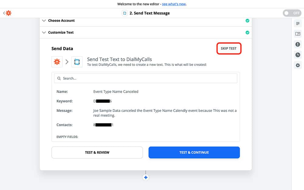 Once again, Zapier will ask you if you want to test your Zap. If you do choose to test it, Zapier will send the template version of the message to your phone number (or whichever phone number you entered in the Contacts field). Otherwise, you can select SKIP TEST to continue.