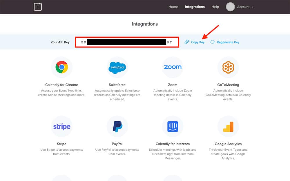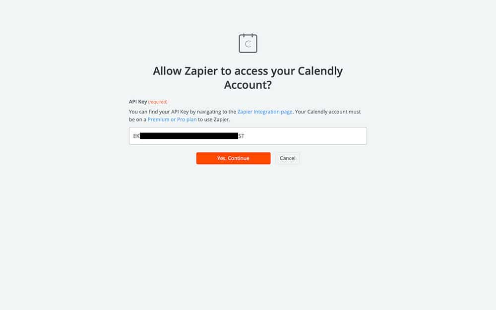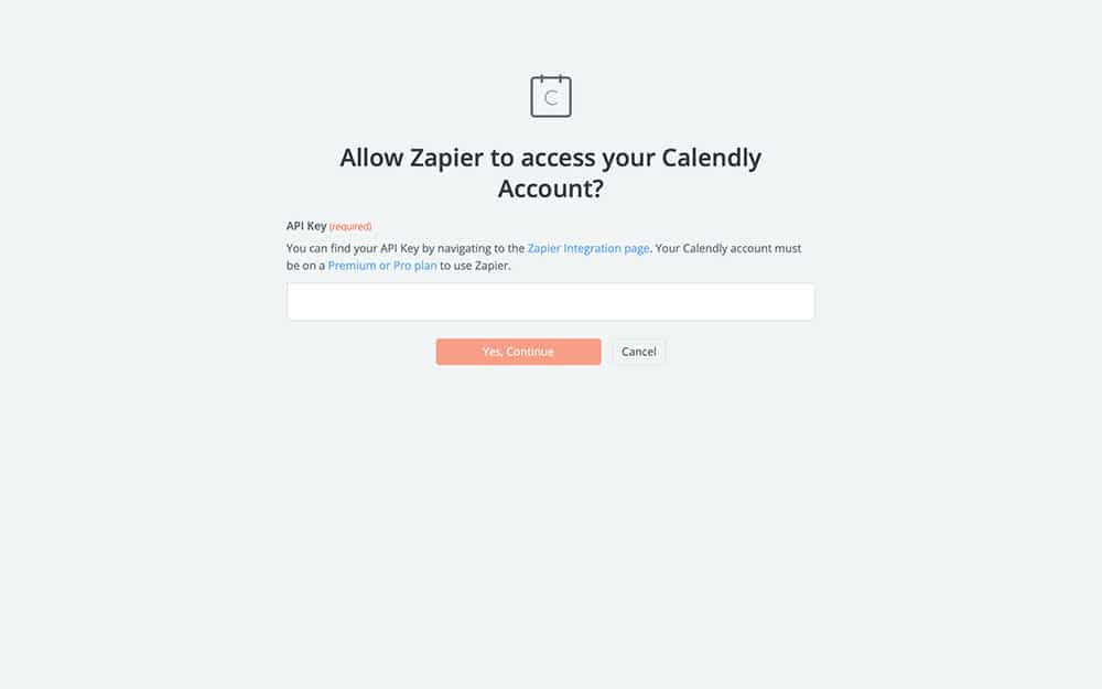 Every Calendly account has a unique API Key, which is what allows you to integrate it with other services like Zapier. All we’re going to do is copy your unique API key into the field shown above.