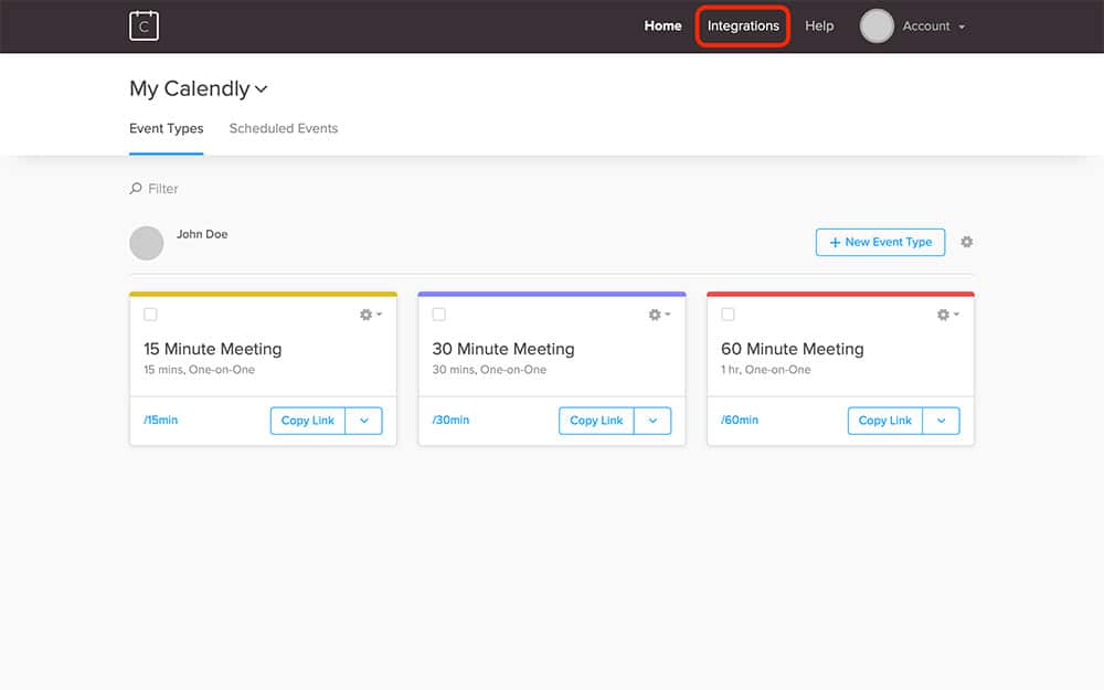 To find your Calendly API key, log in to Calendly in a new tab. Once there, you should see an option called Integrations in the top right of your screen: