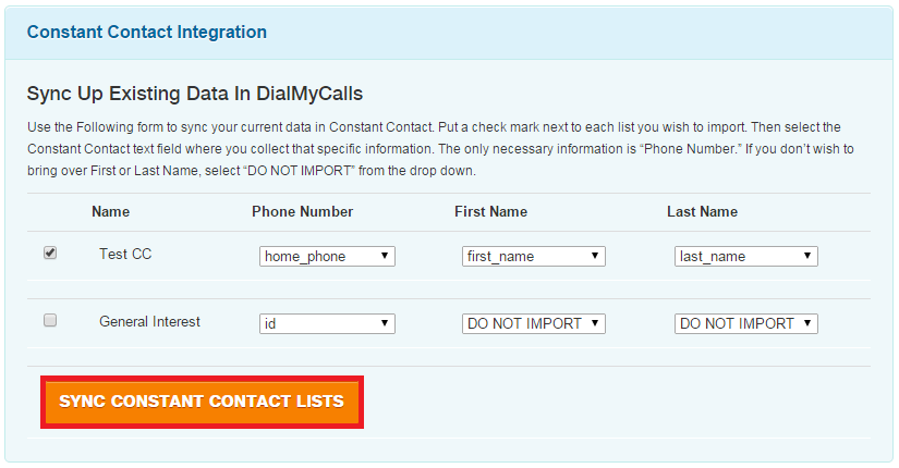 On the Constant Contact integration page in your DialMyCalls account you will now have the option to sync your existing data. Please select the subscription group(s) you would like to sync up with DialMyCalls and make sure that you choose the appropriate form fields – please keep in mind that a 10-digit phone number is required for the integration to work.