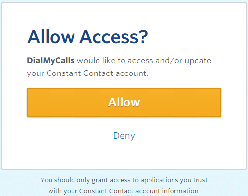 Upon clicking the “Connect Constant Contact Account” button you will be prompted to login to your Constant Contact account. Once logged in, it will ask you if you want to authorize DialMyCalls to utilize the account – click “Allow” to link your two accounts.