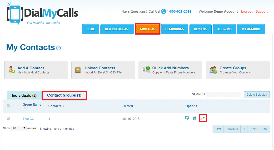 Your Constant Contact subscription lists that were synced will now be listed under the “Contacts” tab in your DialMyCalls account. Contacts and contact groups that are synced will have a Constant Contact icon to the right of them so that you can quickly and easily send a voice broadcast or SMS text message to the correct contacts and subscription groups.