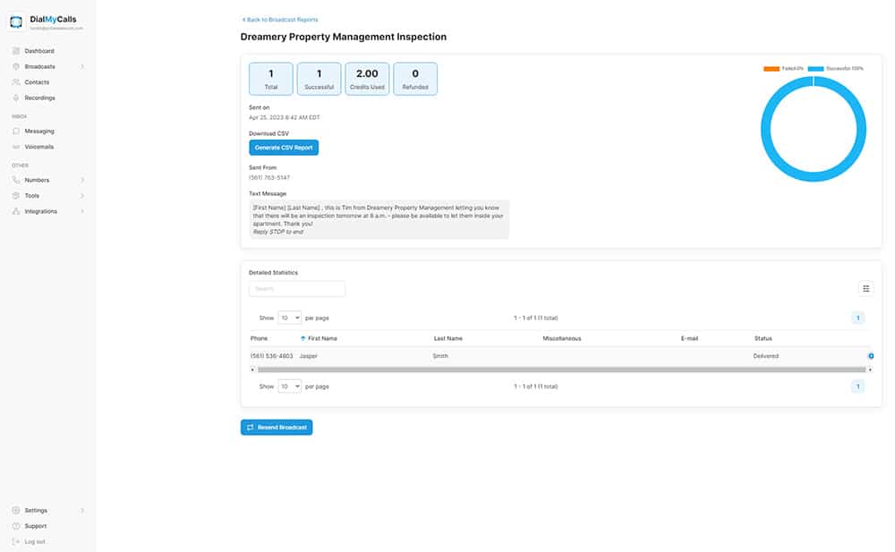 You will be able to listen to the recording that went out and the check out the statistics for that call; the total number of numbers called, amount of successful calls, amount of unsuccessful calls, as well as the amount of credits refunded will be displayed. (Clicking on the “Generate CSV Report” button will create a downloadable report for you to keep.)