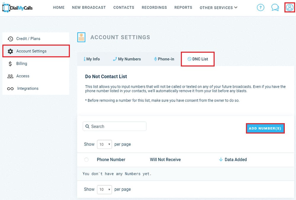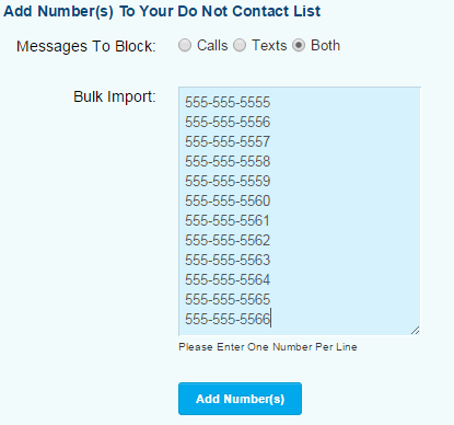 Once logged into your account, you have the ability to ensure that certain phone numbers will no longer receive voice and/or text messages from you – adding numbers to your own do not contact list is quick and easy.