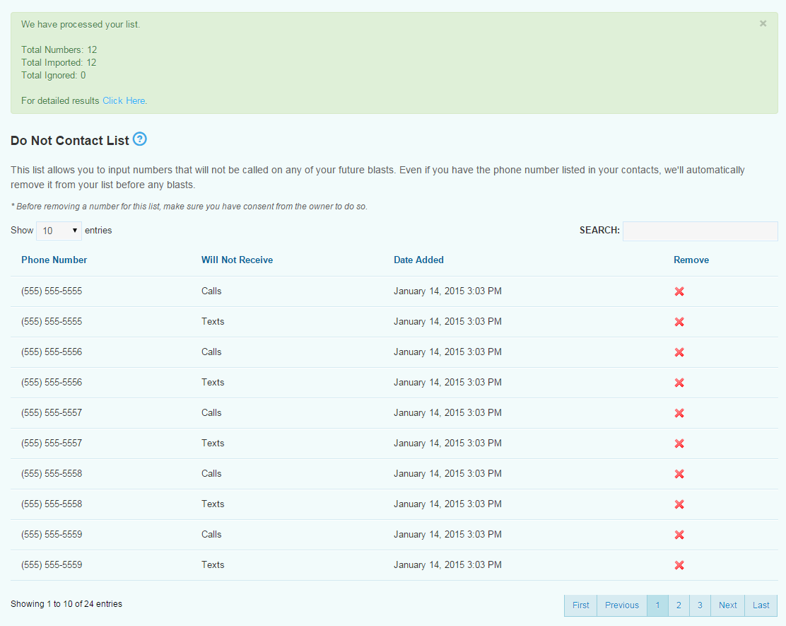 Once a number is added to your Personal Do Not Contact list it will give you a confirmation and then list all of the numbers that will no longer receive messages from you. You are able to remove a number from your DNC list if the recipient contacts you and lets you know they’d like to receive your messages once more.