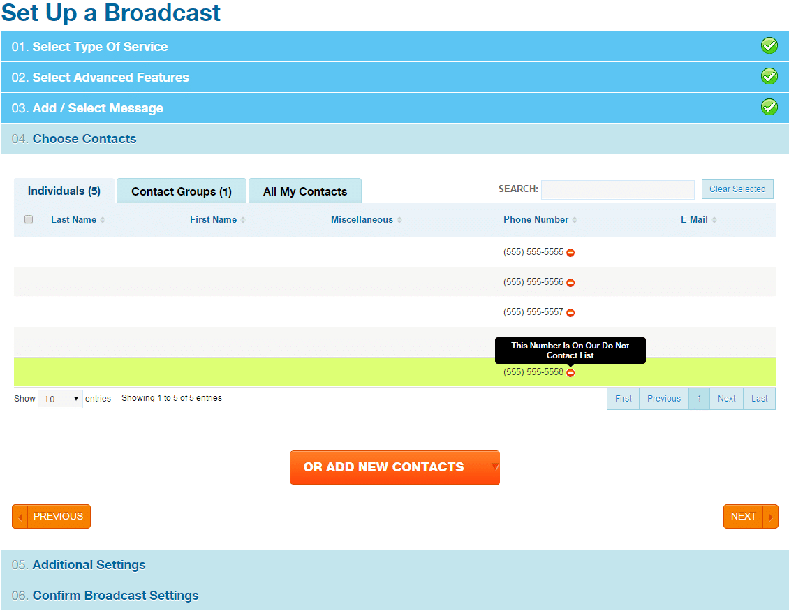 When you go to set up a voice or text message broadcast, on the contact selection step you will see a little red negative sign next to any phone number that is on your DNC list – these numbers will be automatically skipped by our system and will not receive a text or call. *Note: If you do not have any numbers on your personal do not contact list and you still see the red negative signs by some of your contacts, that means they are on our sitewide DNC list – that number will have to contact us to be removed from our DNC list to receive your messages.
