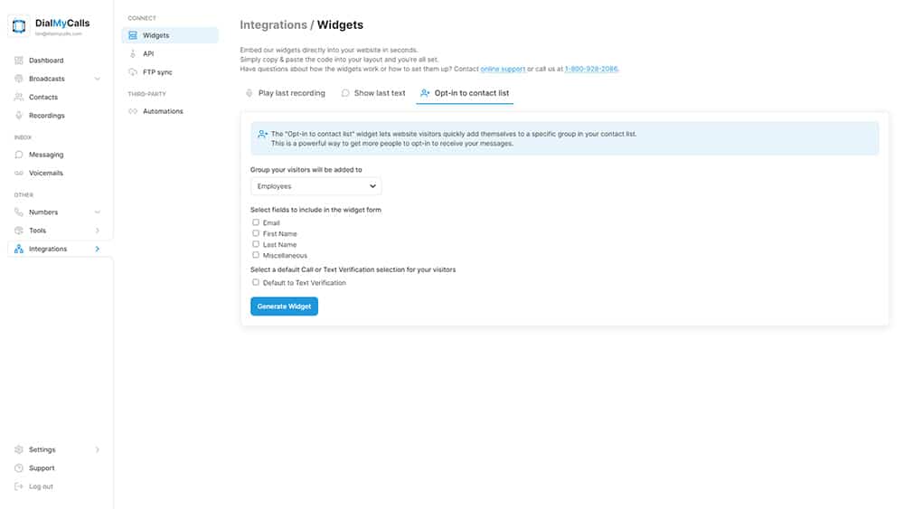 Embeddable widgets are available to all customers and can be found by logging into your DialMyCalls account and then clicking on Integrations” -> “Widgets”.