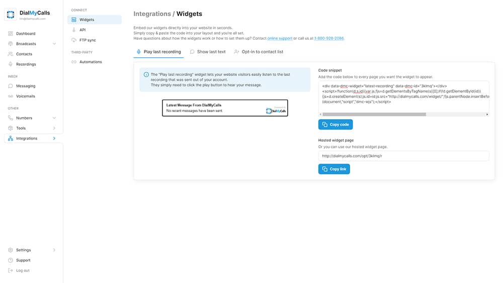 Now you can give visitors of your website the ability to listen to the latest recording that was sent out from your DialMyCalls account. Our embeddable widget is available to everyone with an account – simply copy/paste the code provided into your own website and your visitors can now listen to your latest message!