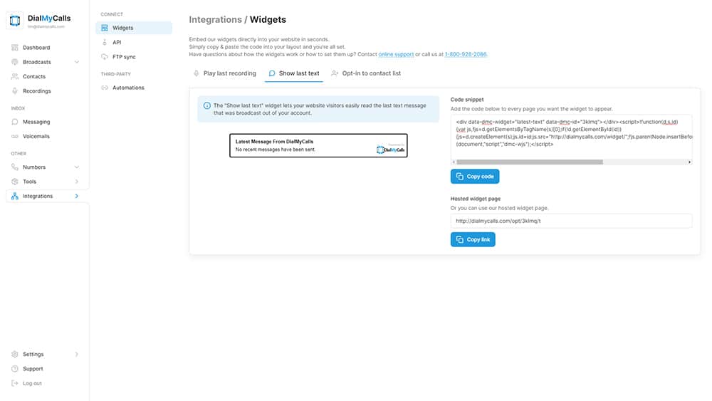You can create a widget to embed your last text message broadcast you send from your DialMyCalls account. This widget is our most recent addition to the embeddable widgets we provide.