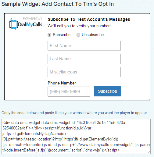 Your brand new opt-in widget is now ready to use. Simply copy/paste the provided code into your website and start collecting phone numbers that wish to receive your DialMyCalls voice broadcasts. When a visitor types in their phone number and hits subscribe they will be called immediately and given a verification code that they must enter – their number will be added to your DialMyCalls account once it has been verified.