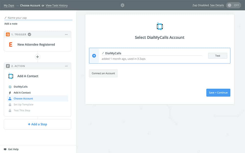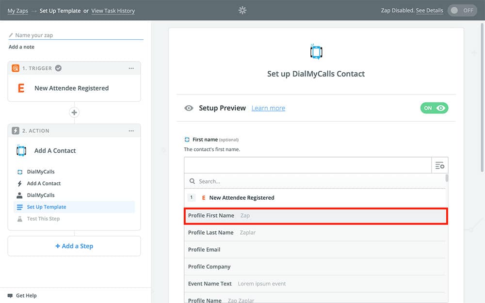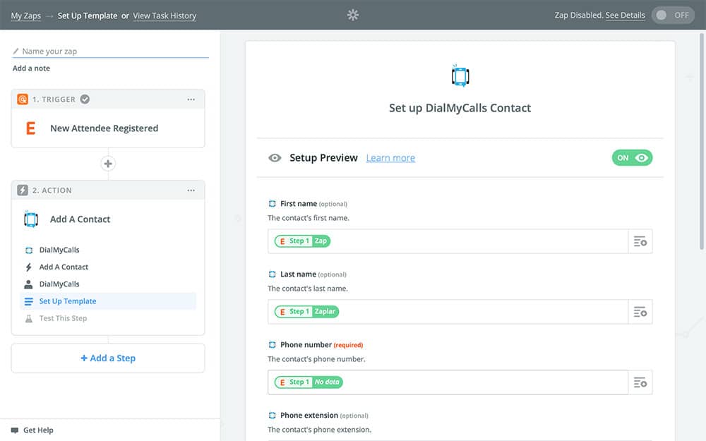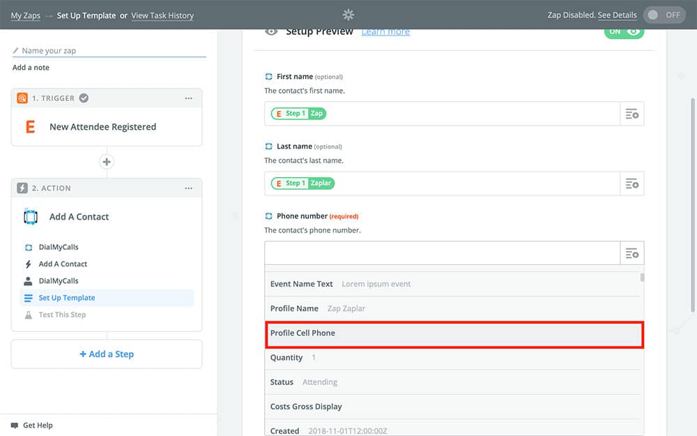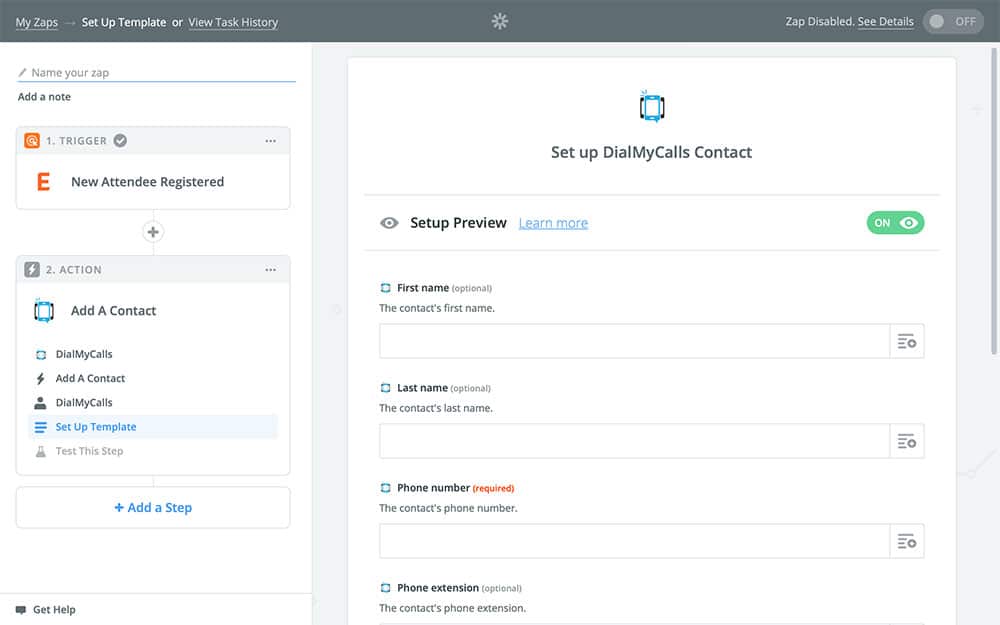 - Set our Zap to add the new attendee to DialMyCalls as a contact using the name and phone number