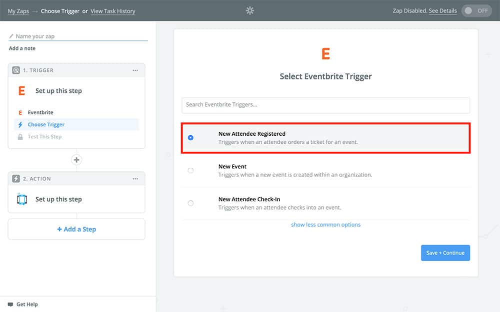 This is where we’re going to create our Zap’s Eventbrite Trigger. The Trigger is what tells your Zap when to run. In our case, we want this Zap to run every time a new attendee registers for our event. So, choose New Attendee Registered like in the screenshot above, and Continue.