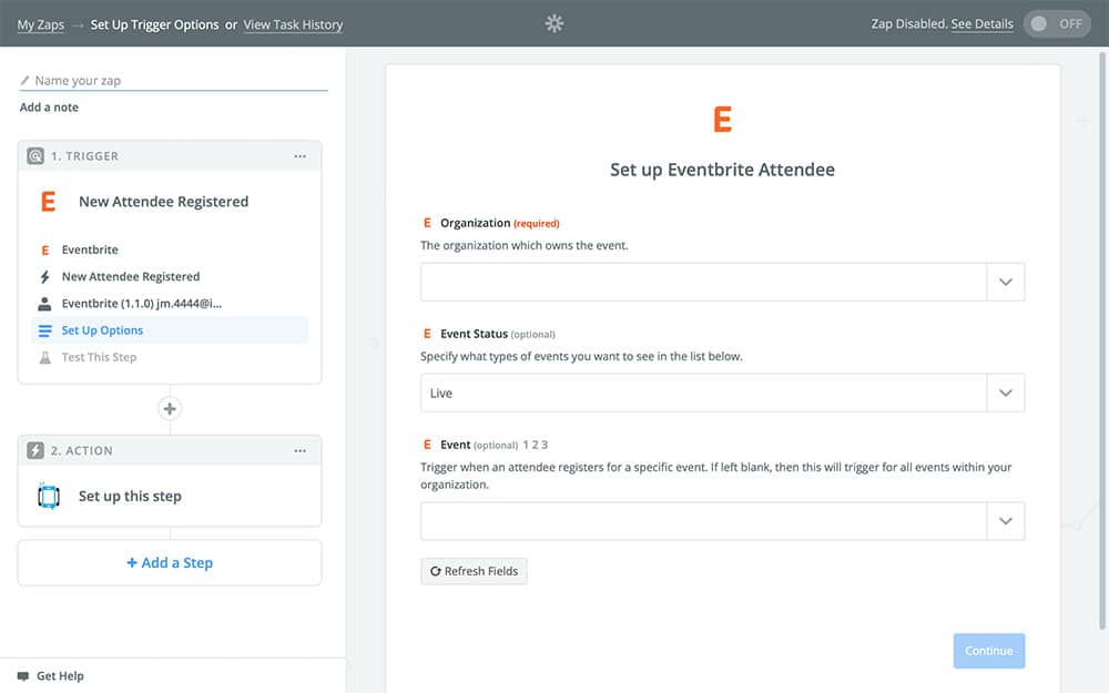 Next, you’re going to need to connect your Eventbrite account to Zapier, if you haven’t done so before. Just click the Connect Account button to do so, and follow the on-screen prompts. Once you have it selected, Continue: