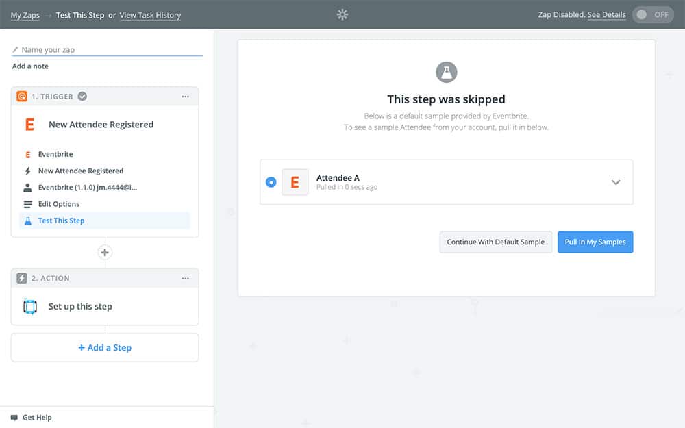 Next, you’re going to pick the sample that we’re going to use when creating the rest of this Zap. The sample is just a template attendee that Zapier will use to make creating your Zap easier – they won’t actually be used when your Zap runs for real. We always use randomly generated samples, though you can pull one from your existing attendees if you like: