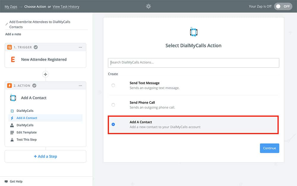 We’re in the homestretch now! This is the part where we’re going to establish what our Zap does when it’s told to run. In our case, that’s going to be adding our new attendee to our DialMyCalls contacts.