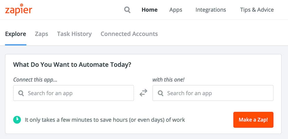 The first step is the simplest, and if you’re familiar with Zapier, you’ve likely done this a hundred times. To start, you need to create a Zap that connects Google Calendar to DialMyCalls. If you’re on the homepage of your Zapier account, you should see the following screen: