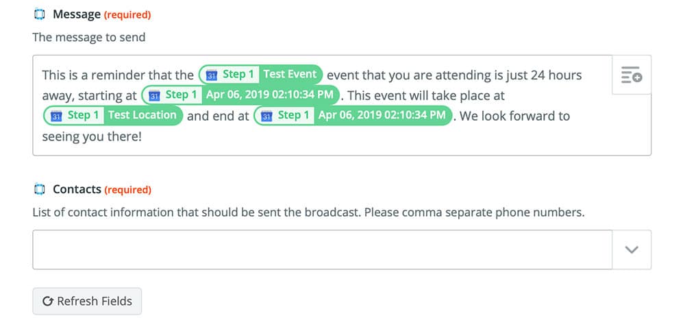 All of the green bubbles will change automatically depending on the event that triggers your Zap. Keep in mind that if you include variables like Location (as in the above image) that your events will all have to have a Location attached to them. Otherwise, your message won’t send correctly.