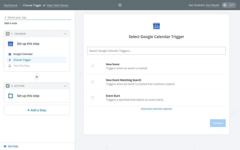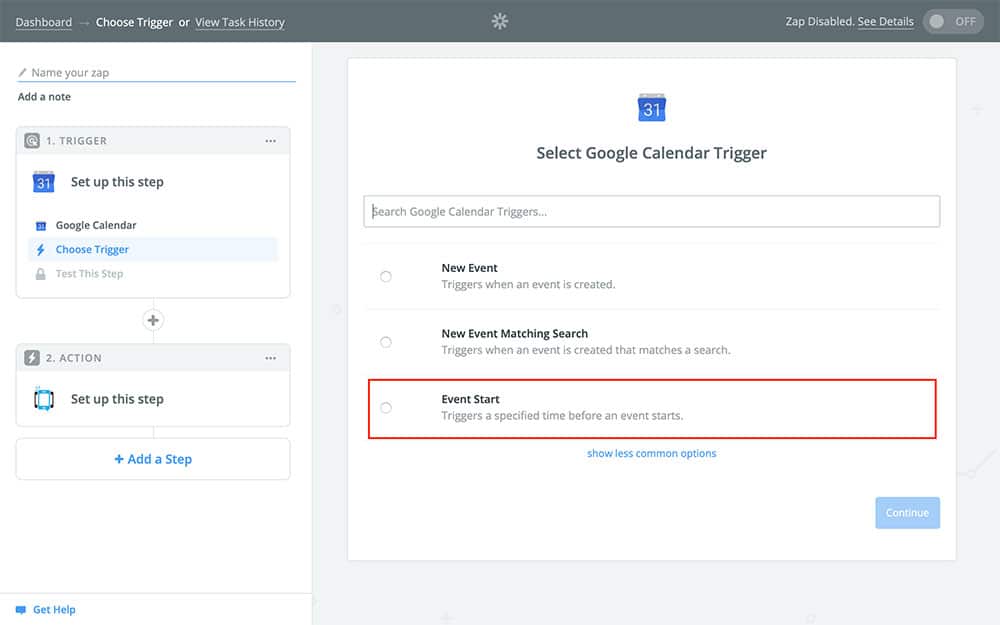 If you don’t see the option you’re looking for, you can type it into the search field or click show less common options at the bottom of the page. Once you’ve got your trigger selected, hit Continue.