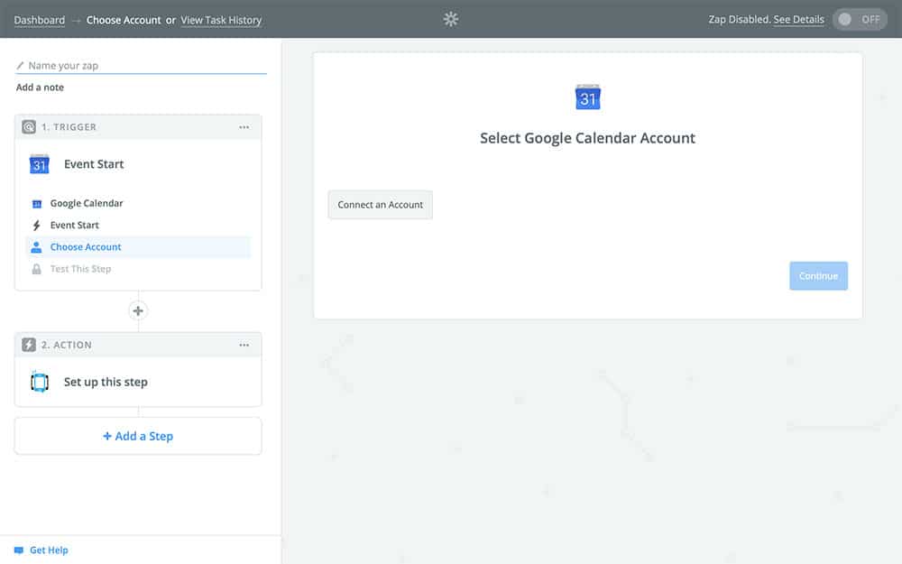 If you’ve used Google with Zapier before, you should see your Google account as an option on this page. Otherwise, you’ll select Connect an Account and go through the Google sign-in process. After you’ve done this, you can Continue.