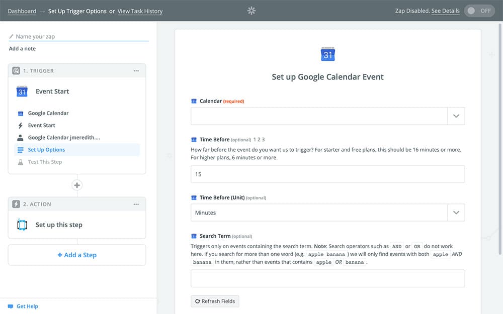The last field, Search Term, gives you control over which events trigger your Zap to run by using a keyword. Say, for example, that you were a venue, and you wanted to send out reminders to ticket purchasers about a concert the day before it starts. However, your venue also shows magic acts, and you keep these events in the same calendar as your concert events. Since you don’t want your concert-goers getting magic-act notifications, you would type “concert” in the Search Term box. This way, only your calendar events that have “concert” in the title will trigger this Zap.