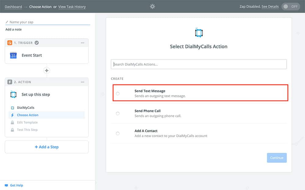 Next, we’re going to decide what DialMyCalls is going to do once your Zap is running. In our case, that’s going to be Send Text Message. Choose it from the available options (as shown below) and Continue to the next step.