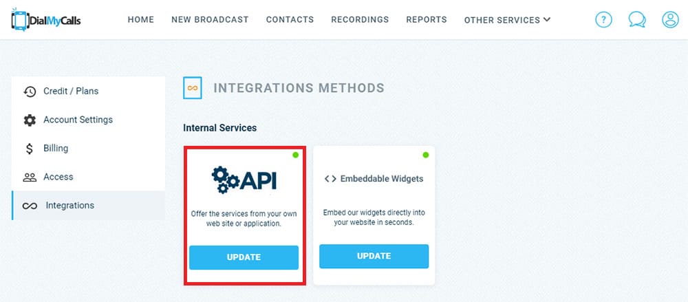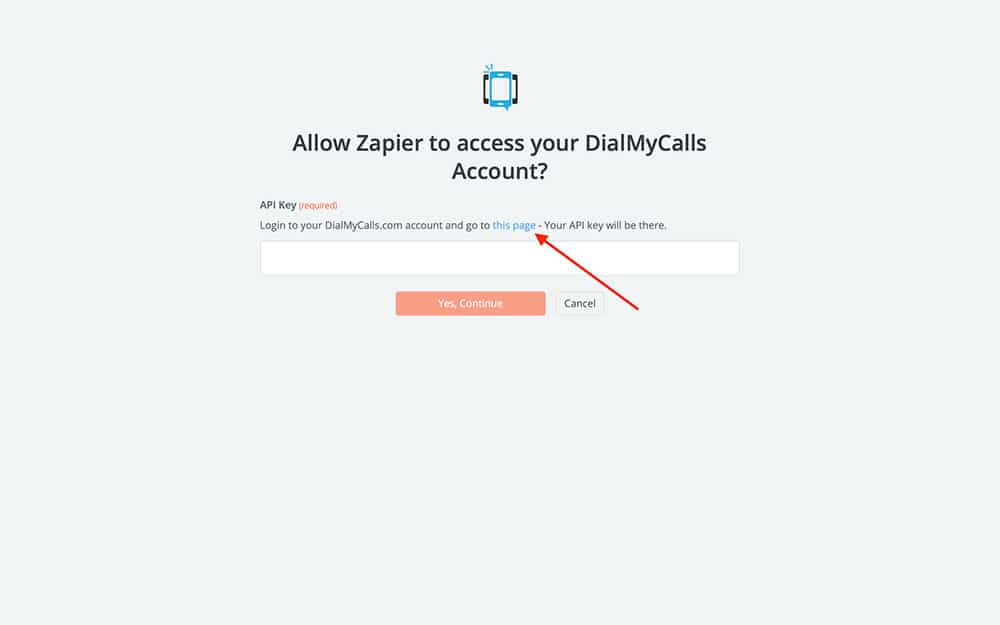 This is where you’ll paste your API key from DialMyCalls. You can find this key in your account on your own, or use the link provided by Zapier, indicated by the red arrow in the above image. Clicking on this link will take you to the following page: