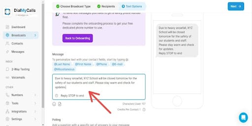 Type out your custom reminder text message and choose to send it to a list of contacts or individual contacts. Use DialMyCalls’ variable messaging to send a personalized reminder text to all of your contacts at once – simply use the @FirstName, @LastName variables that will pull from the contact information you added into your account.