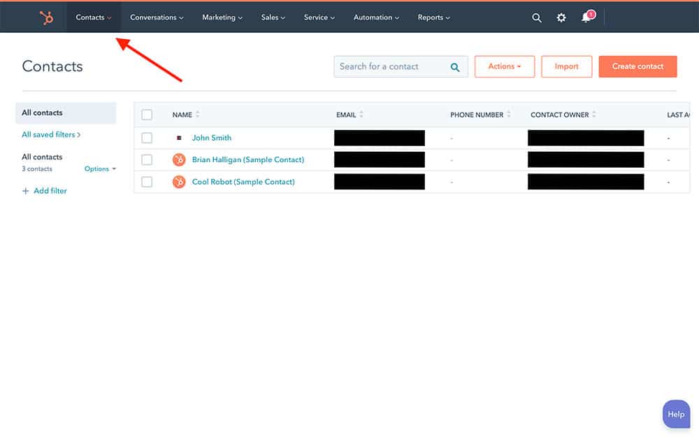 To do this, login to your HubSpot account, and select the Contacts tab: