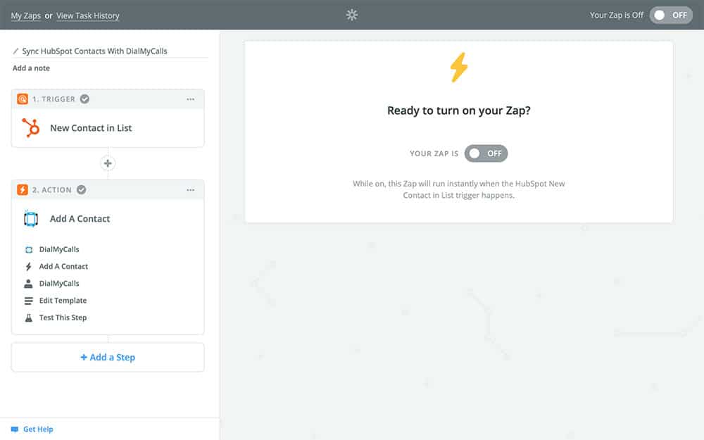 All that’s left to do now is name your Zap and turn it on! Once you turn it on, any HubSpot contacts that are added to your contacts list will automatically be copied to DialMyCalls, keeping the two services in sync with one another.