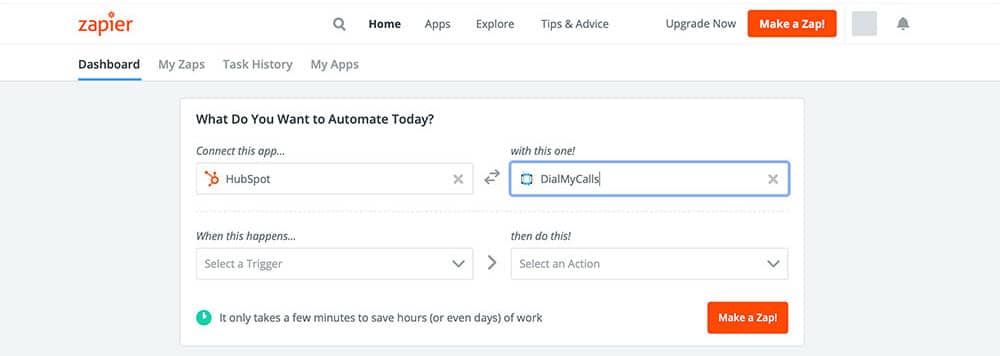 This is where you’ll create the framework for your Zap. In the Connect this app… field, type in “HubSpot,” and select it when it appears. Make sure to select HubSpot and not HubSpot CRM, as these are two different services. In the second field, with this one!, type in “DialMyCalls,” and select it as well. Then, all you have to do is select Make a Zap! In the lower right.