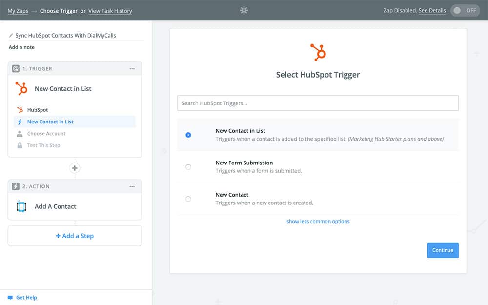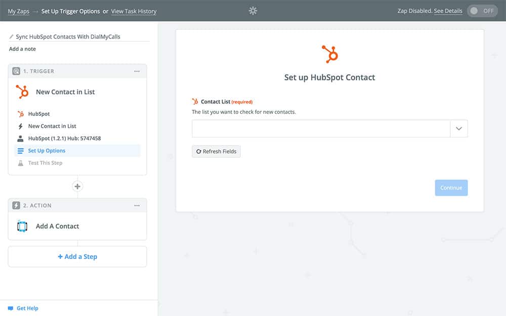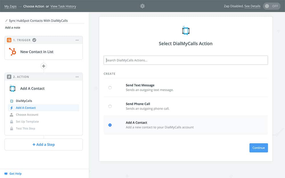 Now that your trigger is created, it’s time to get to the fun part: the action. This is what your Zap is actually going to do once it gets going, which in our case is copying your HubSpot contacts to DialMyCalls.