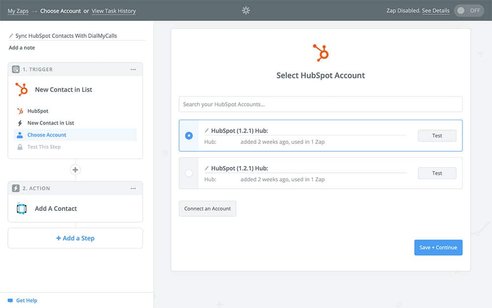 This is where you’ll connect your HubSpot account to your Zap. If you’ve already used HubSpot with Zapier before, you should see your HubSpot account as an option, like in the screenshot above. Otherwise, you’ll need to connect your account. Once you’ve done this, Continue.