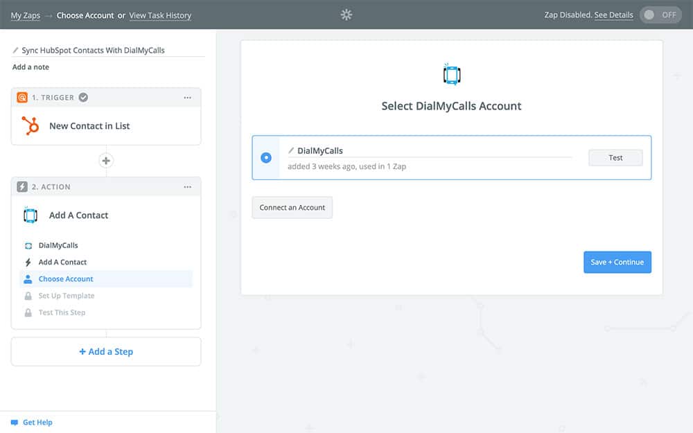 If you’ve used DialMyCalls with Zapier before, you should see your account as an option. Otherwise, follow the steps it takes you through to connect your account. Once finished, Continue to the next section.