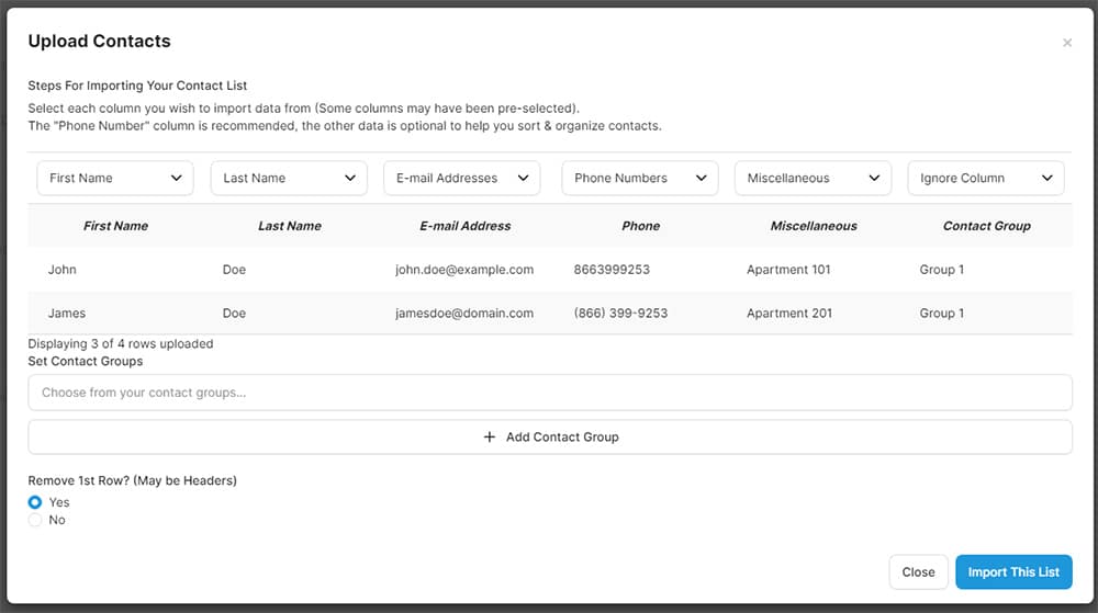 After our system recognizes your database you will see a preview window of your file on your screen. This step is where you are going to assign the columns of data, letting our system know what to set as the following information: First Name, Last Name, Phone Number, Email Address, Miscellaneous, and Contact Group – please keep in mind that the only required information are the phone numbers, everything else is optional.