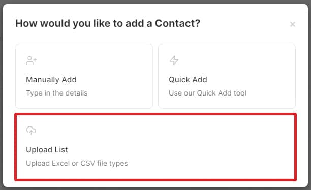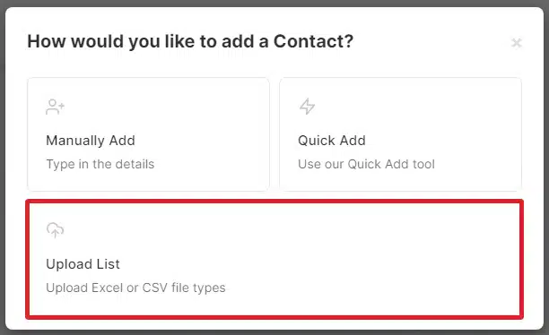 Choosing the import option will first ask you to select the file that you wish to upload into your account – we currently accept . XLS, .XLSX and .CSV file formats.