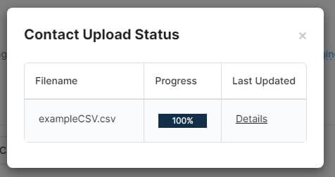 Once you click on “Import This List” the “View Upload Queue” pop-up will appear on your screen. This feature allows you to see real-time progress of every contact list that you have uploaded in that past 24 hours.
