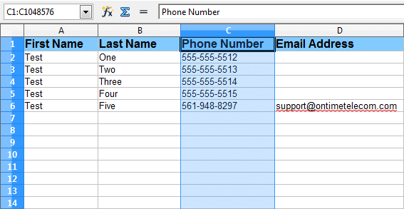 - Step Two: You have the ability to create contact groups right from within your Excel file. Simply create a new column that will contain the group name(s). You will need to have the contact group name in every row next to the numbers you would like to be added to that group. The entry that shows “Test One$$$Test Two$$$Test Three” will add that particular number to three different groups – simply type out the first group name and then add “$$$” between any additional groups you want that contact to be added to.