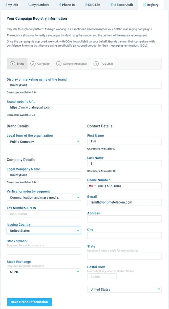 You will need to enter your brand/company details for setting up your local 10DLC number to be registered with The Campaign Registry.